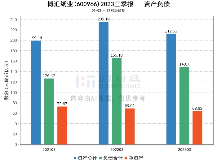 在资产负债方面,博汇纸业2023年三季度末的总资产为212.53亿元,相比上年度末的227.79亿元有所下降。负债总额为148.7亿元,较上年度末的162.61亿元有所减少。净资产为63.83亿元,较上年度末的65.18亿元略有下降。资产负债率为69.97%,较上年度末的71.39%有所降低。