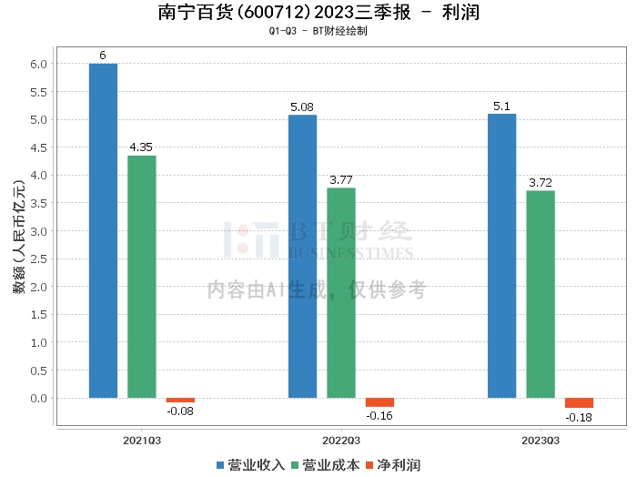 在利润方面,南宁百货公司2023年三季度的营业收入为5.1亿元,与上年同期的5.08亿元相比略有增长。营业成本为3.72亿元,相比上年同期的3.77亿元有所下降。公司的毛利率为26.94%,高于上年同期的25.76%。