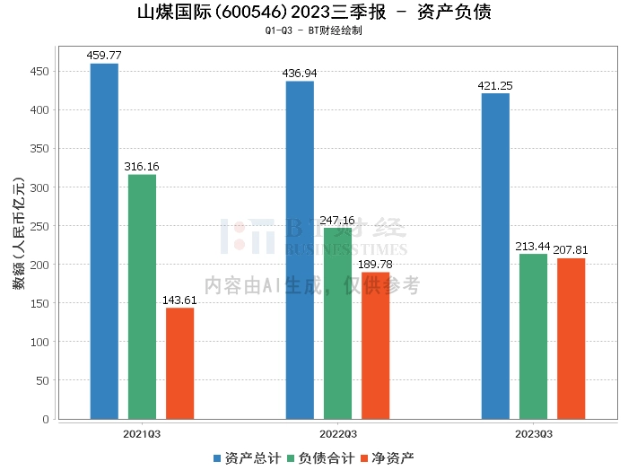 在资产负债方面,山煤国际2023年三季度末的总资产为421.25亿元,相比上年度末的452.76亿元有所减少。负债总额为213.44亿元,较上年度末的265.58亿元也有所下降。净资产为207.81亿元,相比上年度末的187.18亿元有所增长。资产负债率为50.67%,较上年度末的58.66%有所降低。