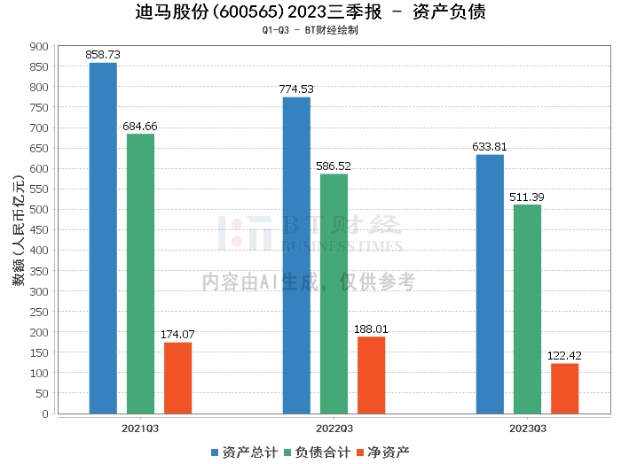 从资产负债方面来看,迪马股份2023年三季度末的总资产为633.81亿元,相比上年度末的703.71亿元有所减少。负债合计为511.39亿元,较上年度末的579.3亿元也有所降低。公司的净资产为122.42亿元,略低于上年度末的124.41亿元。资产负债率为80.68%,较上年度末的82.32%有所下降。