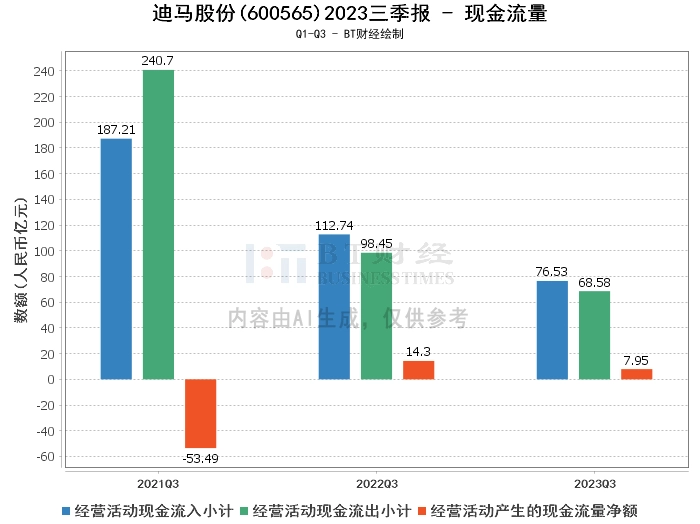 在现金流量方面,迪马股份2023年三季度经营活动产生的现金流量净额为7.95亿元,较上年同期的14.3亿元有所减少。经营活动现金流入小计为76.53亿元,较上年同期的112.74亿元有所减少。经营活动现金流出小计为68.58亿元,较上年同期的98.45亿元有所减少。
