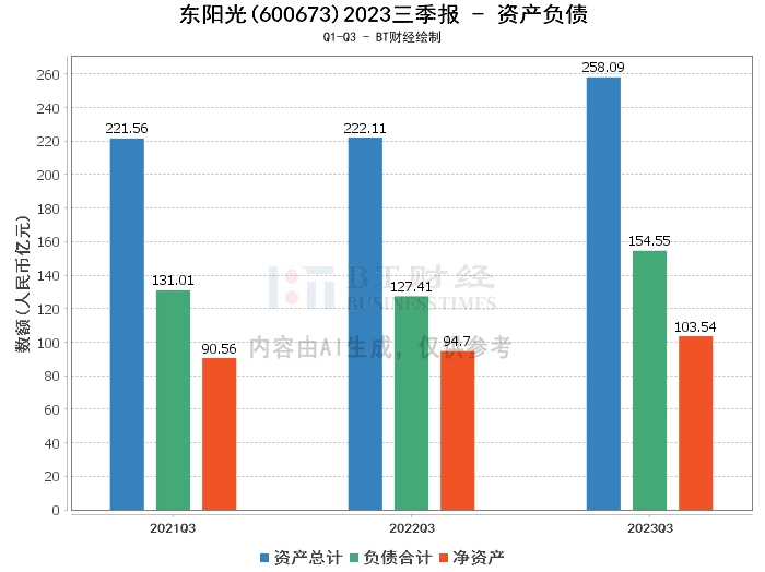 从资产负债方面来看,东阳光2023年三季度末的总资产为258.09亿元,相比上年度末的244.88亿元增长了5.39%。负债合计为154.55亿元,相比上年度末的143.06亿元增长了8.03%。净资产为103.54亿元,相比上年度末的101.82亿元增长了1.69%。资产负债率为59.88%,相比上年度末的58.42%有所上升。