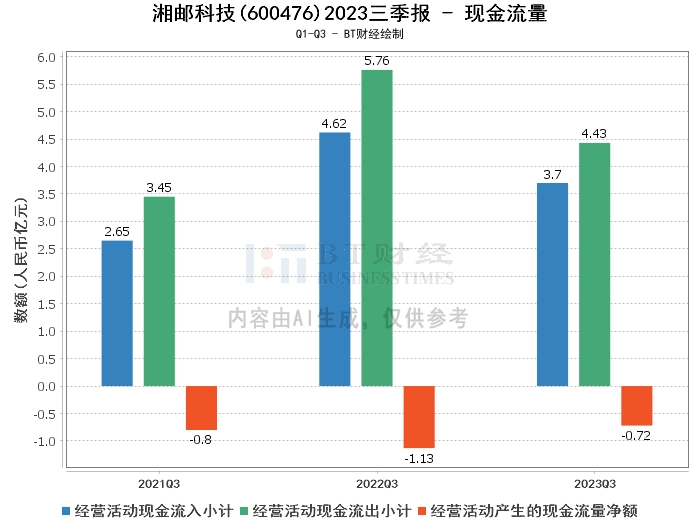 在现金流量方面,湘邮科技的经营活动现金流入小计由上年同期的4.62亿元降至年初至本报告期末的3.7亿元,经营活动现金流出小计由上年同期的5.76亿元降至年初至本报告期末的4.43亿元。经营活动产生的现金流量净额为-7227.21万元,主要系报告期内支付货款减少所致。