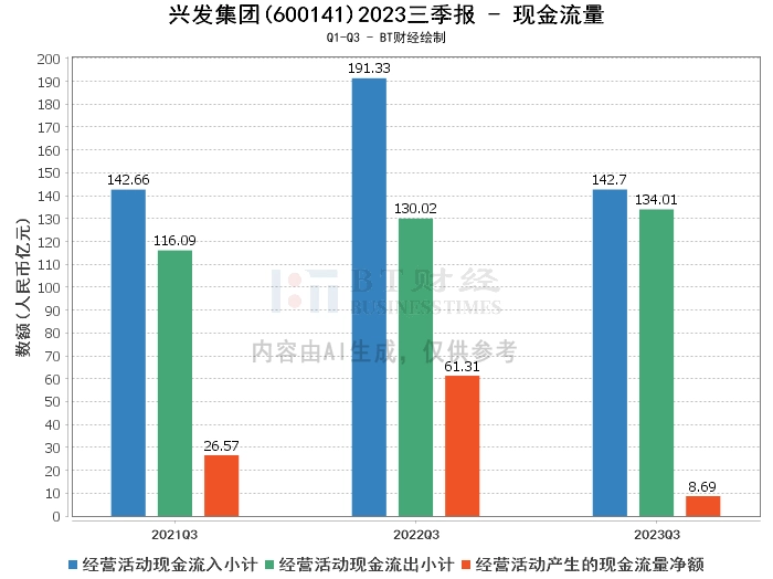 在现金流量方面,公司2023年三季度经营活动产生的现金流量净额为8.69亿元,较上年同期的61.31亿元大幅下降。经营活动现金流入小计为142.7亿元,较上年同期的191.33亿元有所下滑。经营活动现金流出小计为134.01亿元,较上年同期的130.02亿元略有增长。