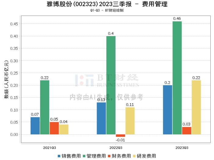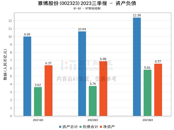 从资产负债方面看,雅博股份在2023年三季度末的总资产为12.38亿元,相比上年度末的11.66亿元有所增长。负债合计为5.81亿元,较上年度末的5亿元有所上升。净资产为6.57亿元,略低于上年度末的6.66亿元。资产负债率为46.96%,较上年度末的42.87%有所提高。