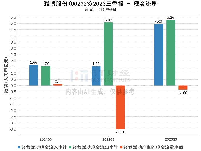 在现金流量方面,雅博股份2023年三季度的经营活动现金流入小计为4.93亿元,较上年同期的1.55亿元大幅增加。经营活动现金流出小计为5.26亿元,较上年同期的5.07亿元有所增加。