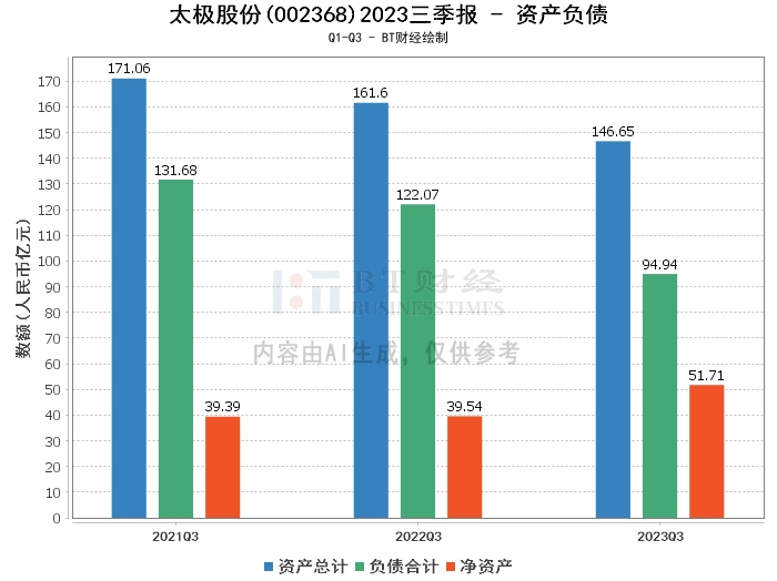 在资产负债方面,太极股份2023年三季度的总资产为146.65亿元,相较于上年度末的158.56亿元有所减少。负债总额为94.94亿元,较上年度末的113.64亿元有所下降。公司的净资产为51.71亿元,较上年度末的44.92亿元有所增长。资产负债率为64.74%,较上年度末的71.67%有所下降。