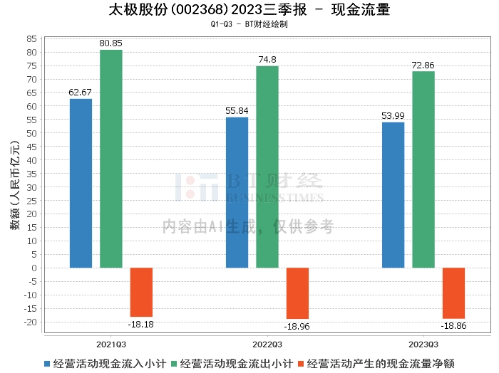 在现金流量方面,太极股份2023年三季度的经营活动现金流入小计为53.99亿元,相较于上年同期的55.84亿元有所减少。经营活动现金流出小计为72.86亿元,较上年同期的74.8亿元有所减少。