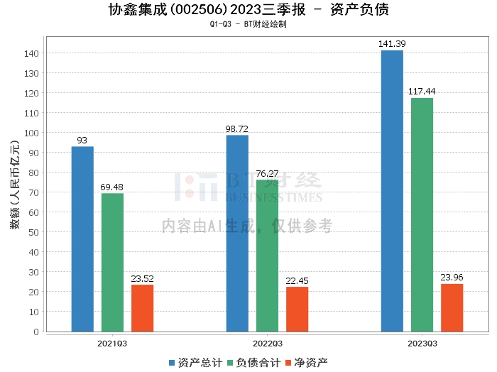 从资产负债方面来看,公司2023年三季度末的总资产为141.39亿元,相比上年度末的101.81亿元增长了38.88%。负债合计为117.44亿元,相比上年度末的79.26亿元增长了48.18%。净资产为23.96亿元,相比上年度末的22.56亿元增长了6.23%。资产负债率为83.06%,相比上年度末的77.84%有所上升。