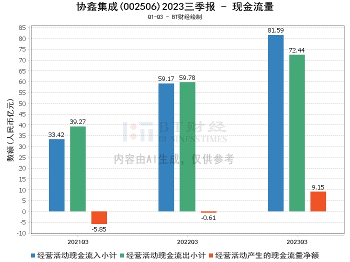 在现金流量方面,公司2023年三季度经营活动产生的现金流量净额为9.15亿元,相比上年同期的-6111.51万元,现金流量状况得到了显著改善。经营活动现金流入小计为81.59亿元,相比上年同期的59.17亿元有所增长。经营活动现金流出小计为72.44亿元,相比上年同期的59.78亿元有所增长。