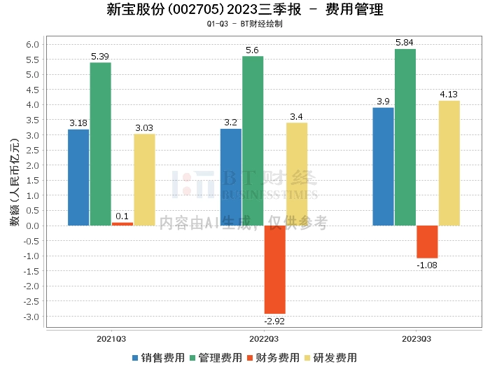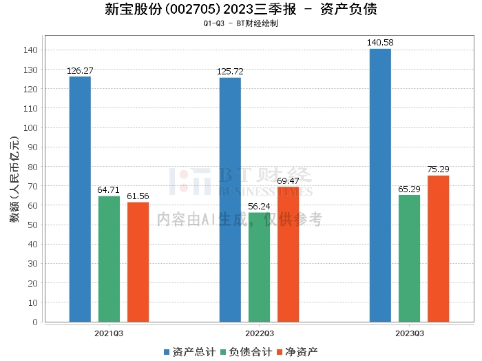 从资产负债方面来看,新宝股份2023年三季度的总资产为140.58亿元,相比上年度末的128.65亿元有所增长。负债合计为65.29亿元,较上年度末的57.6亿元有所上升。净资产为75.29亿元,相比上年度末的71.04亿元有所增长。资产负债率为46.44%,较上年度末的44.78%有所上升。