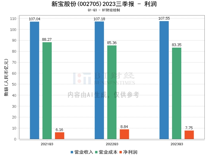 在利润方面,新宝股份2023年三季度的营业收入为107.55亿元,与上年同期的107.18亿元基本持平。营业利润为9.7亿元,较上年同期的10.77亿元有所下降。营业成本为83.35亿元,较上年同期的85.36亿元有所下降。净利润为7.75亿元,较上年同期的8.84亿元有所下降。