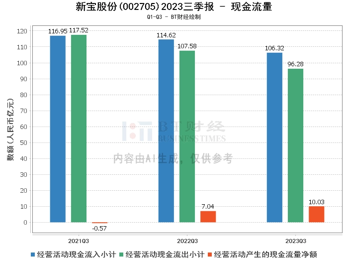 在现金流量方面,新宝股份2023年三季度经营活动产生的现金流量净额为10.03亿元,较上年同期的7.04亿元有显著提升。经营活动现金流入小计为106.32亿元,较上年同期的114.62亿元有所下降。经营活动现金流出小计为96.28亿元,较上年同期的107.58亿元有所下降。