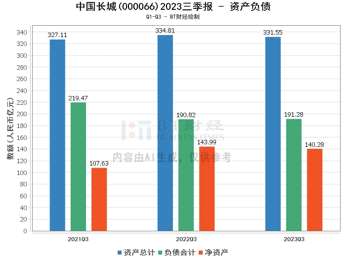 在资产负债方面,2023年三季度末,中国长城的资产总计331.55亿元,相较于上年度末的338.74亿元有所减少。负债合计191.28亿元,略高于上年度末的190.24亿元。商誉本报告期末为2528.65万元,略高于上年度末的2461.52万元。净资产本报告期末为140.28亿元,相较于上年度末的148.5亿元有所减少。资产负债率本报告期末为57.69%,略高于上年度末的56.16%。