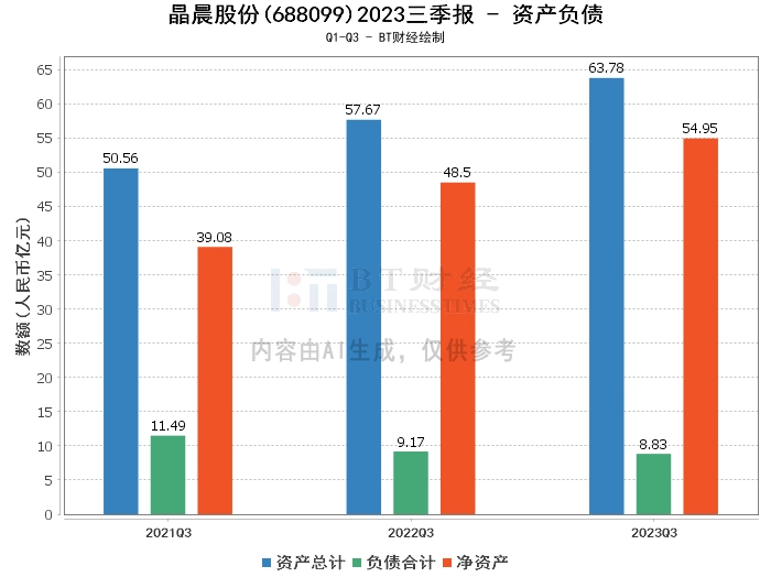 在资产负债方面,晶晨股份2023年三季度末的总资产为63.78亿元,相比上年度末的58.65亿元有所增长。负债合计为8.83亿元,相比上年度末的9.33亿元有所减少。净资产为54.95亿元,相比上年度末的49.32亿元有所增长。资产负债率为13.85%,相比上年度末的15.92%有所下降。