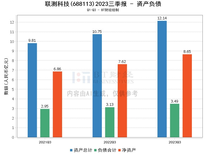 从资产负债方面来看,联测科技2023年三季度末的总资产为12.14亿元,相比上年度末的11.35亿元,增长了7.03%。负债合计为3.49亿元,略高于上年度末的3.4亿元。公司的净资产为8.65亿元,较上年度末的7.95亿元有所增长。资产负债率为28.78%,较上年度末的29.94%有所降低。
