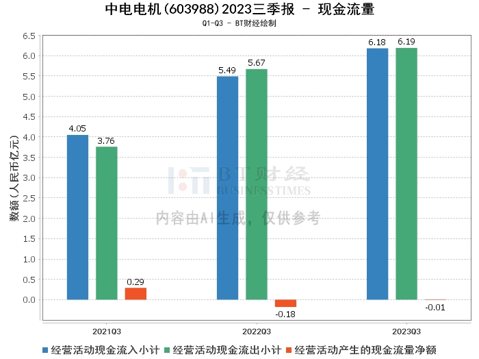 在现金流量方面,2023年三季度,中电电机的经营活动现金流入小计为6.18亿元,较上年同期的5.49亿元有所增加。经营活动现金流出小计为6.19亿元,较上年同期的5.67亿元有所增加。经营活动产生的现金流量净额为-69.57万元,较上年同期有所增加,主要是销售商品收到的现金及收到其他与经营活动有关的现金增加所致。