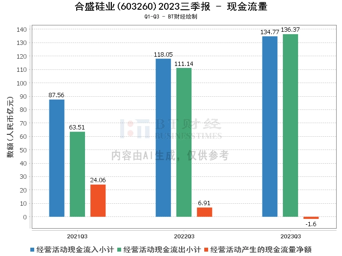 在现金流量方面,年初至2023年三季度末,经营活动产生的现金流量净额为-1.6亿元,相比上年同期的6.91亿元有所下滑。经营活动现金流入小计为134.77亿元,相比上年同期的118.05亿元有所增长。经营活动现金流出小计为136.37亿元,相比上年同期的111.14亿元有所增长。这主要是由于采购原料支付的金额增加所致。