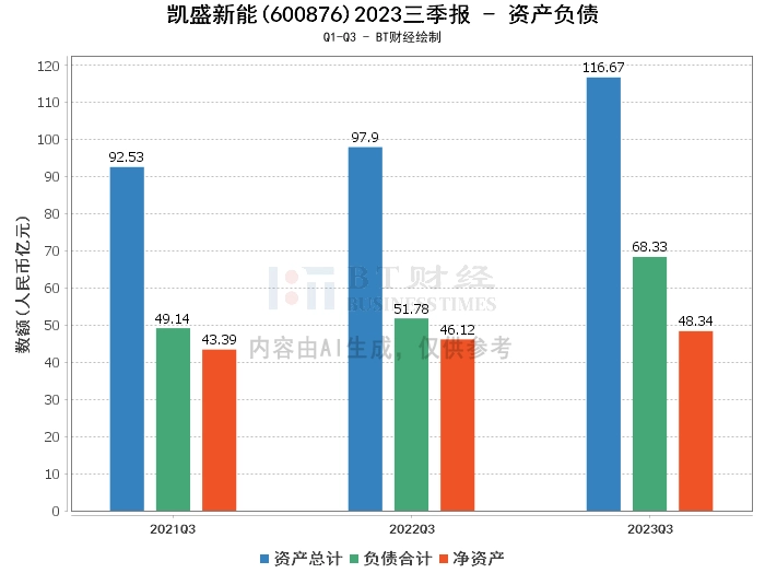 在资产负债方面,2023年三季度末,凯盛新能的总资产为116.67亿元,相比上年度末的105.66亿元增长10.42%。负债合计为68.33亿元,相比上年度末的59.52亿元增长。净资产为48.34亿元,相比上年度末的46.14亿元有所增长。资产负债率为58.57%,相比上年度末的56.33%有所上升。
