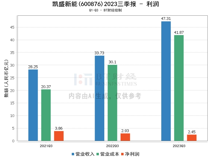 在利润方面,凯盛新能2023年三季度的营业收入为47.31亿元,相比上年同期的33.73亿元增长40.27%,主要系光伏玻璃销量同比增加。营业成本为41.87亿元,相比上年同期的30.1亿元增长39.12%,主要系光伏玻璃销量同比增加,营业成本相应增加。营业利润为2.73亿元,相比上年同期的3.03亿元有所下降。净利润为2.45亿元,相比上年同期的2.93亿元有所下降。
