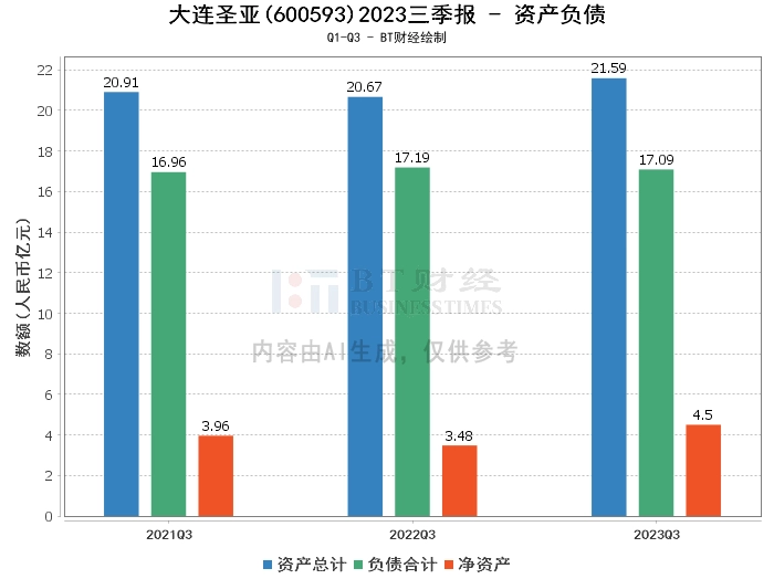 在资产负债方面,大连圣亚2023年三季度末的总资产为21.59亿元,相较于上年度末的20.35亿元有所增长。负债合计为17.09亿元,较上年度末的17.29亿元略有下降。公司的净资产为4.5亿元,较上年度末的3.06亿元有所增加。资产负债率为79.15%,相较于上年度末的84.96%有所下降。