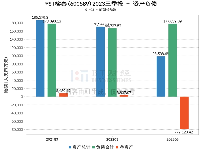 从资产负债方面来看,*ST榕泰2023年三季度末的总资产为9.85亿元,相比上年度末的11.1亿元有所下降。负债合计为17.77亿元,与上年度末的17.79亿元基本持平。资产负债率为180.29%,较上年度末的160.36%有所提升。