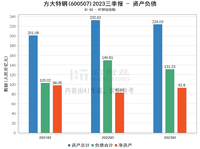 从资产负债方面来看,2023年三季度,方大特钢的总资产为224.03亿元,相比上年度末的193.91亿元有所增加。负债合计为131.23亿元,较上年度末的102.77亿元增加。净资产为92.8亿元,相比上年度末的91.15亿元略有增长。资产负债率为58.58%,相比上年度末的53%有所上升。