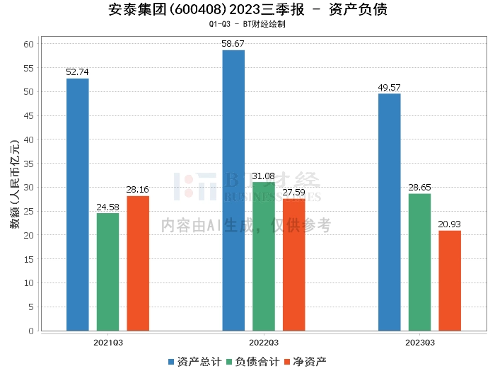 从资产负债方面来看,2023年三季度末,安泰集团的总资产为49.57亿元,相比上年度末的52.08亿元有所下降。负债合计为28.65亿元,相比上年度末的26.82亿元有所增加。净资产为20.93亿元,相比上年度末的25.26亿元有所减少。资产负债率为57.78%,相比上年度末的51.49%有所上升。