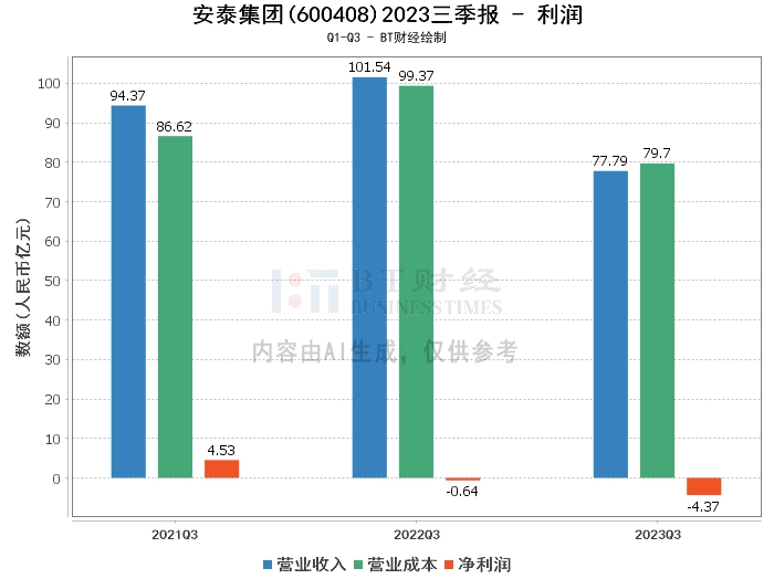 在利润方面,2023年三季度,安泰集团的营业收入为77.79亿元,相比上年同期的101.54亿元有所减少。营业成本为79.7亿元,相比上年同期的99.37亿元有所减少。毛利率为-2.45%,相比上年同期的2.14%有所下降。归属于上市公司股东的净利润为-4.37亿元。这主要是由于报告期内受钢铁和焦化行业市场波动影响,公司主要产品焦炭、型钢的销售价格同比降低,而主要原材料煤炭、钢坯的采购价格跌幅小于其产品的销售价格跌幅所致。