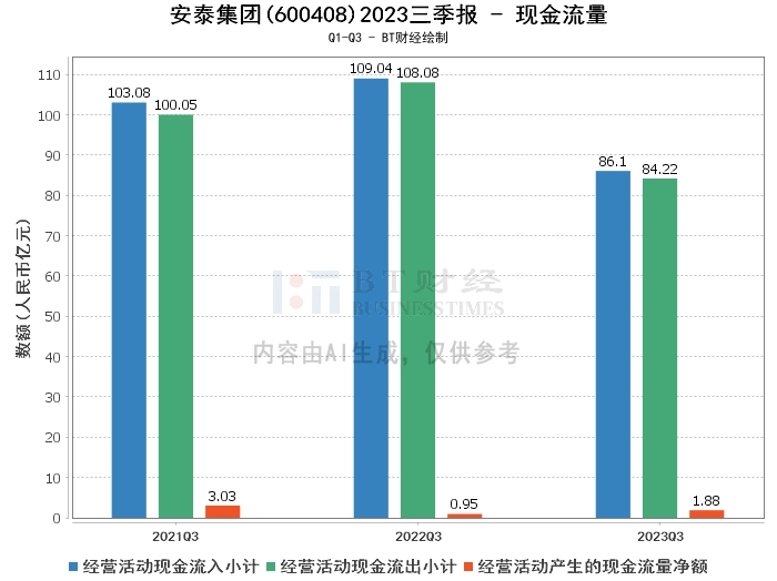 在现金流量方面,2023年三季度,安泰集团的经营活动产生的现金流量净额为1.88亿元,相比上年同期的9524.14万元有显著增加。经营活动现金流入小计为86.1亿元,相比上年同期的109.04亿元有所减少。经营活动现金流出小计为84.22亿元,相比上年同期的108.08亿元有所减少。经营活动产生的现金流量净额的增加,主要是报告期内销售预收款同比增加,以及支付的各项税费减少所致。