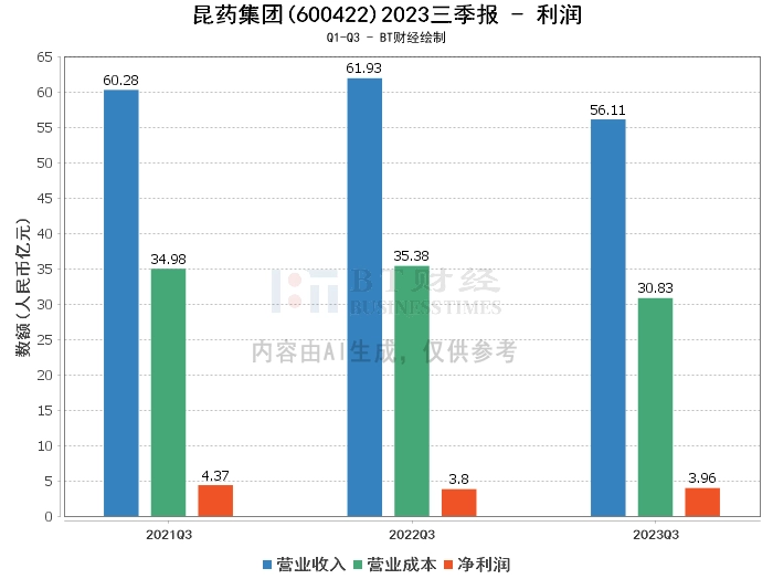在利润方面,昆药集团2023年三季度的营业收入为56.11亿元,相比上年同期的61.93亿元有所下降。营业利润为4.76亿元,较上年同期的4.68亿元略有增加。营业成本为30.83亿元,较上年同期的35.38亿元减少。净利润为3.96亿元,较上年同期的3.8亿元有所增加。