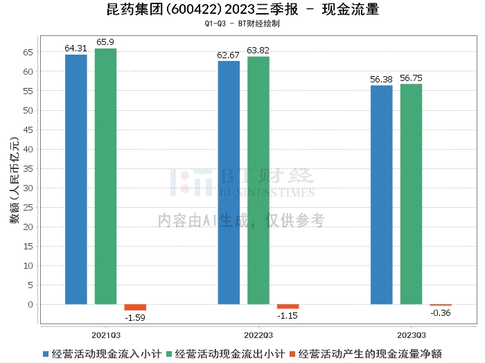 在现金流量方面,昆药集团2023年三季度的经营活动现金流入小计为56.38亿元,较上年同期的62.67亿元减少。经营活动现金流出小计为56.75亿元,较上年同期的63.82亿元减少。