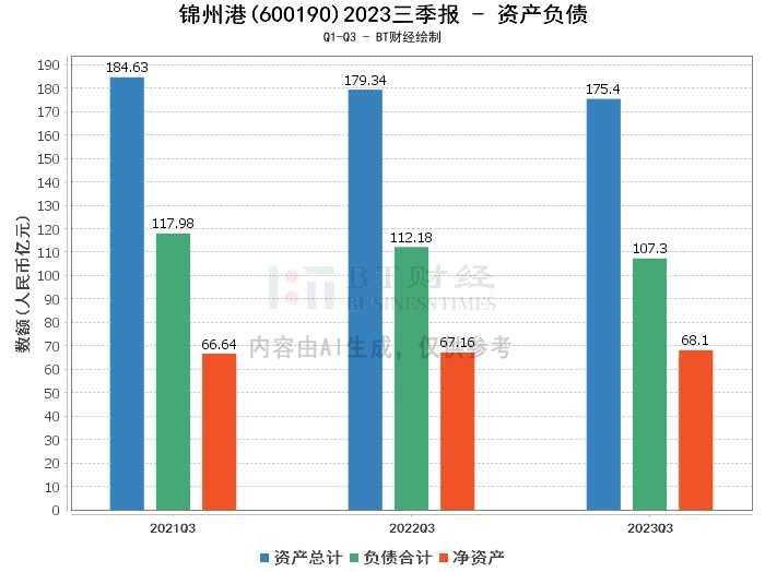 在资产负债方面,2023年三季度末,锦州港的资产总计为175.4亿元,较上年度末的176.75亿元略有下降。负债合计为107.3亿元,较上年度末的109.17亿元有所减少。净资产为68.1亿元,较上年度末的67.58亿元有所增长。资产负债率为61.17%,较上年度末的61.77%有所下降。