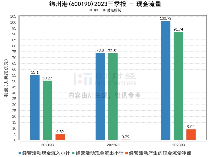在现金流量方面,锦州港2023年三季度的经营活动产生的现金流量净额为9.04亿元,较上年同期的2878.25万元大幅增长3039.18%,主要是本期以商业票据、供应链金融结算付款增加所致。
