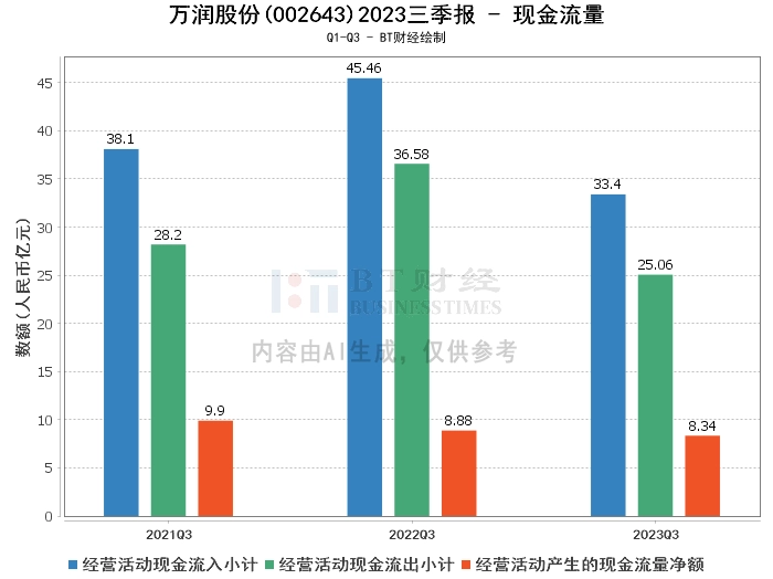 在现金流量方面,2023年年初至三季度末,公司经营活动产生的现金流量净额为8.34亿元,较上年同期的8.88亿元有所减少。经营活动现金流入小计为33.4亿元,较上年同期的45.46亿元有所减少。经营活动现金流出小计为25.06亿元,较上年同期的36.58亿元有所减少。经营活动现金流出小计的减少主要系本期采购业务同比减少,购买商品支付的现金、支付的各项税费相应减少。