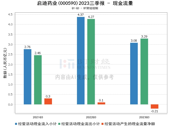 在现金流量方面,启迪药业2023年三季度的经营活动产生的现金流量净额为-2103.92万元,较上年同期的964.08万元大幅度下降。经营活动现金流入小计为3.08亿元,较上年同期的4.37亿元有所减少。经营活动现金流出小计为3.29亿元,较上年同期的4.27亿元有所增加。财报数据显示,现金流量净额的下降主要是由于经营活动现金流入的减少。