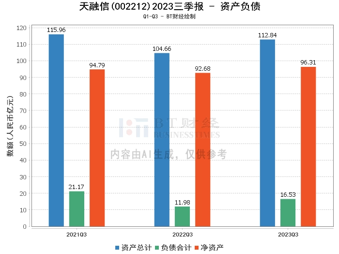 从资产负债方面来看,天融信2023年三季度的总资产为112.84亿元,相比上年度末的119.86亿元有所下降。负债合计为16.53亿元,较上年度末的22.05亿元减少。净资产为96.31亿元,较上年度末的97.81亿元略有下降。资产负债率为14.65%,较上年度末的18.4%有所降低。