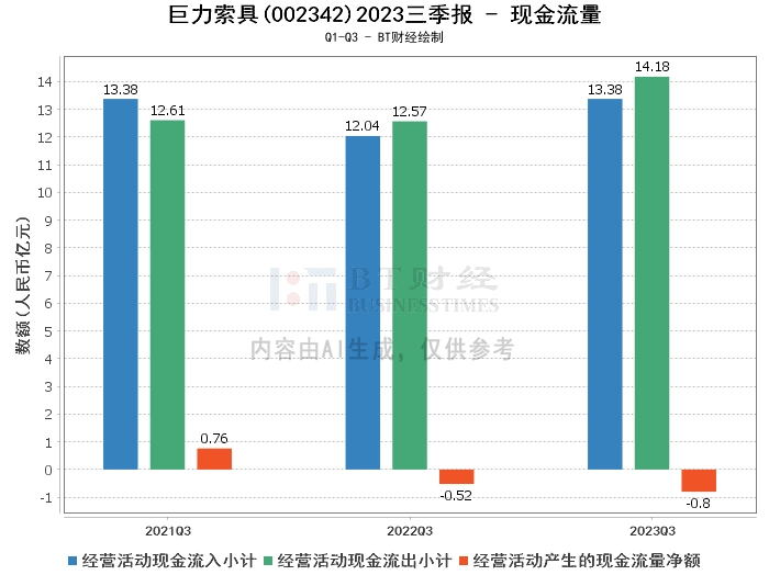 在现金流量方面,公司2023年三季度的经营活动现金流入小计为13.38亿元,较上年同期的12.04亿元有所增长。经营活动现金流出小计为14.18亿元,较上年同期的12.57亿元有所增加。