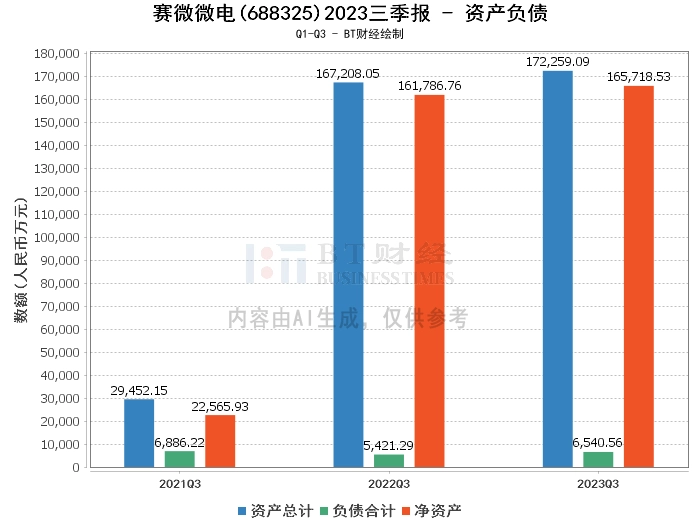 从资产负债方面来看,赛微微电2023年三季度的总资产为17.23亿元,相比上年度末的17.01亿元有所增长。负债合计为6540.56万元,相比上年度末的5492.58万元有所增加。净资产为16.57亿元,相比上年度末的16.46亿元有所增长。资产负债率为3.8%,相比上年度末的3.23%有所上升。