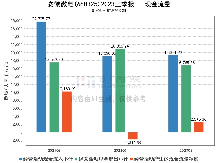在现金流量方面,赛微微电2023年三季度的经营活动产生的现金流量净额为2545.36万元,相比上年同期的-1815.99万元有所改善,主要系购买商品、接受劳务支付的现金减少所致。