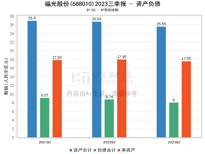 在资产负债方面,福光股份2023年三季度的总资产为25.55亿元,相较于上年度末的28.1亿元有所下滑。负债合计为8亿元,较上年度末的10.13亿元有所减少。净资产为17.55亿元,略低于上年度末的17.97亿元。资产负债率为31.3%,较上年度末的36.04%有所下降。