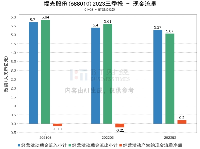 在现金流量方面,福光股份2023年三季度的经营活动产生的现金流量净额为1977.95万元,较上年同期的-2120.74万元扭亏为盈。经营活动现金流入小计为5.27亿元,较上年同期的5.4亿元略有减少。经营活动现金流出小计为5.07亿元,较上年同期的5.61亿元有所减少。