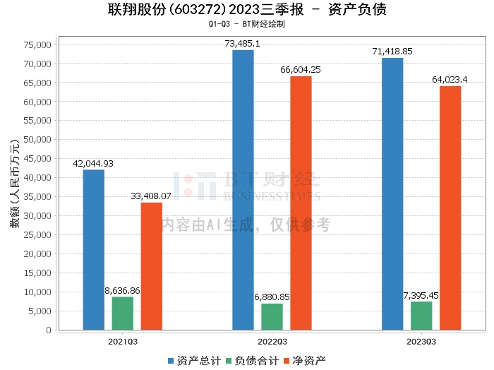 从资产负债方面来看,联翔股份2023年三季度末的总资产为7.14亿元,相比上年度末的7.3亿元有所减少。负债合计为7395.45万元,较上年度末的7824.18万元有所下降。公司的净资产为6.4亿元,相比上年度末的6.52亿元有所减少。资产负债率为10.36%,较上年度末的10.72%有所下降。