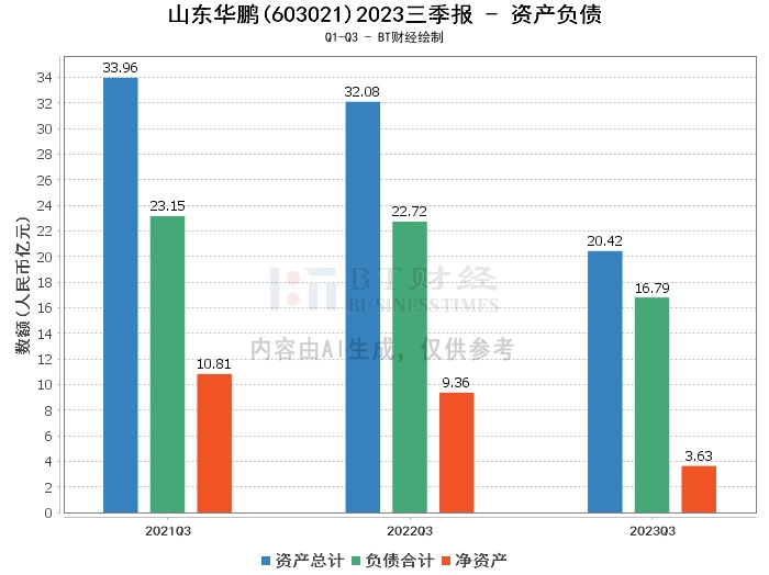 在资产负债方面,山东华鹏2023年三季度的总资产为20.42亿元,相比上年度末的23.57亿元有所下滑。负债合计为16.79亿元,较上年度末的18.36亿元有所减少。净资产为3.63亿元,较上年度末的5.2亿元有所减少。资产负债率为82.22%,较上年度末的77.91%有所上升。