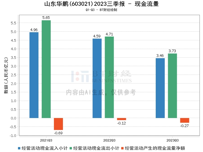 在现金流量方面,山东华鹏2023年三季度的经营活动现金流入小计为3.46亿元,较上年同期的4.59亿元有所减少。经营活动现金流出小计为3.73亿元,较上年同期的4.71亿元有所减少。经营活动产生的现金流量净额为-2699.78万元,较上年同期有所减少。