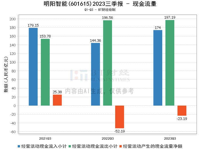 在现金流量方面,明阳智能2023年三季度的经营活动现金流入小计为174亿元,相比上年同期的144.36亿元有所增长。经营活动现金流出小计为197.19亿元,相比上年同期的196.56亿元略有增长。