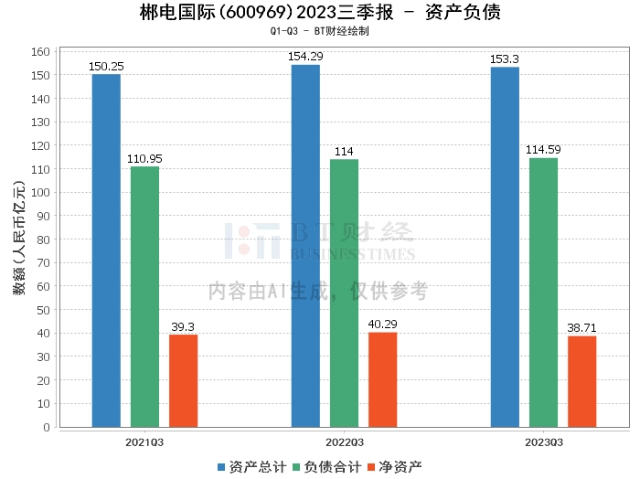 在资产负债方面,郴电国际2023年三季度末的总资产为153.3亿元,相较于上年度末的155.61亿元有所下降。负债合计为114.59亿元,较上年度末的116.79亿元也有所减少。净资产为38.71亿元,略低于上年度末的38.82亿元。资产负债率为74.75%,较上年度末的75.05%有所下降。