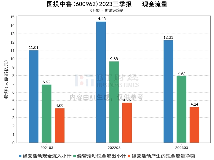 2023年三季度,国投中鲁经营活动产生的现金流量净额为4.24亿元,较上年同期的4.75亿元有所减少。经营活动现金流入小计为12.21亿元,较上年同期的14.43亿元有所减少。经营活动现金流出小计为7.97亿元,较上年同期的9.68亿元有所减少。