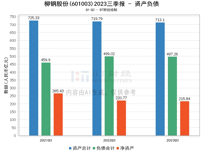 在资产负债方面,柳钢股份2023年三季度末的总资产为713.1亿元,相比上年度末的714.12亿元略有下降。负债合计为497.26亿元,相比上年度末的488.5亿元有所增加。净资产为215.84亿元,相比上年度末的225.62亿元有所减少。资产负债率为69.73%,相比上年度末的68.41%有所上升。