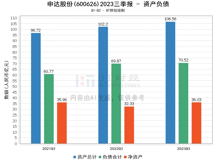 在资产负债方面,2023年三季度末,申达股份的总资产为106.56亿元,相较上年度末的103.72亿元有所增长。负债合计为70.52亿元,相比上年度末的70.63亿元略有下降。净资产为36.03亿元,较上年度末的33.09亿元增加。资产负债率为66.18%,较上年度末的68.1%有所下降。